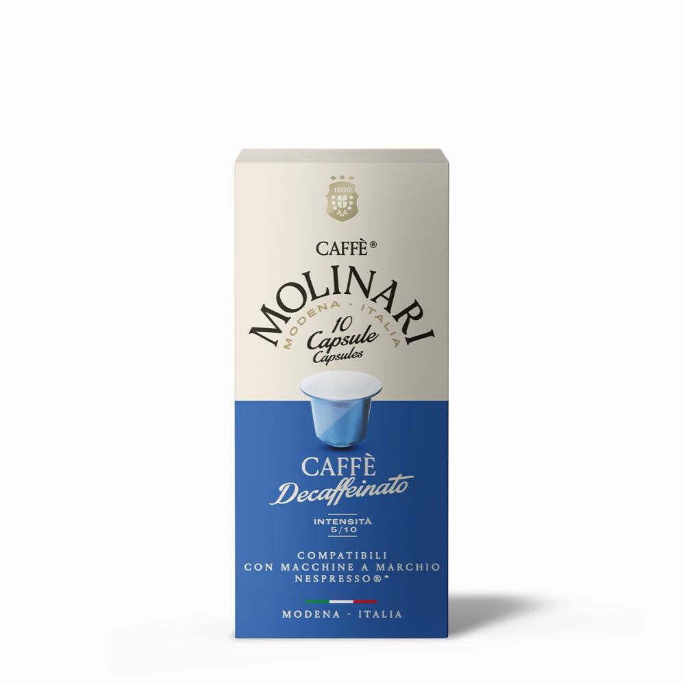 يمكنك الآن الاستماع بكبسولات قهوة منزوعة الكافيين من موليناري خيار سهل وسريع التحضير، بالإضافة إلى أنه مثالي لمن يرغبون بتناول القهوة دون كافيين وهي مكونة من حبوب بن أرابيكا 100% وتحديدًا من دول "حزام القهوة، وهي مناسبة للاستخدام في آلات اسبريسو.